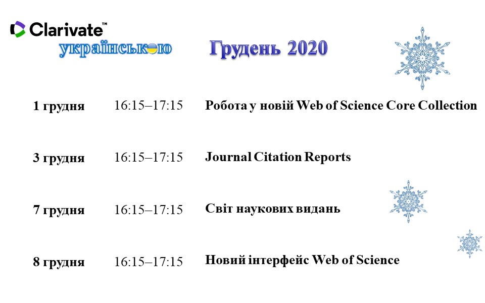 Clarivate Analytics запрошує взяти участь у серії безкоштовних вебінарів, які триватимуть з 01 по 08 грудня 2020 року.
