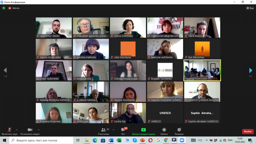 14 березня відбулася Міжнародна онлайн конференція «Потреби українських митців та працівників культури під час війни», організована Секретаріатом ЮНЕСКО з питань Конвенції «Про охорону та заохочення розмаїття форм культурного самовираження». В конференції взяли участь митці, керівники культурних організацій та медіа Києва, Одеси, Харкова, Дніпропетровської області, Львова та інших міст і областей України.