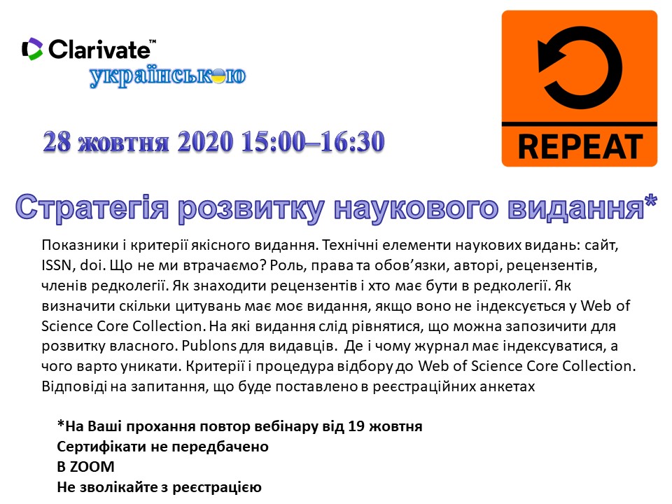 28 жовтня 2020 15:00–16:30 відбудеться повтор вебінару для редколегій та редакцій наукових видань, що був організований 19 жовтня науковою бібліотекою КПІ.